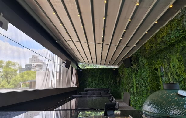 Gracias a su sistema patentando Stormguard y a sus textiles 100% waterproof, el sistema de pérgola puede cubrir grandes espacios, brindando impermeabilidad presionando un botón